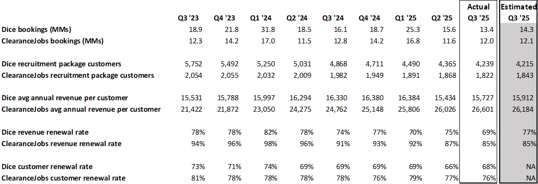 Q3 revenue of $32.1 million (-9.0% Y/Y) was ahead of our $31.0 million estimate and consensus of $31.1 million. Dice revenue of $18.2 million (-15.2% Y/Y) was in line with our $18.1 million projection, while ClearanceJobs revenue of $13.9 million (+0.7% Y/Y) was well above our $12.9 million estimate.